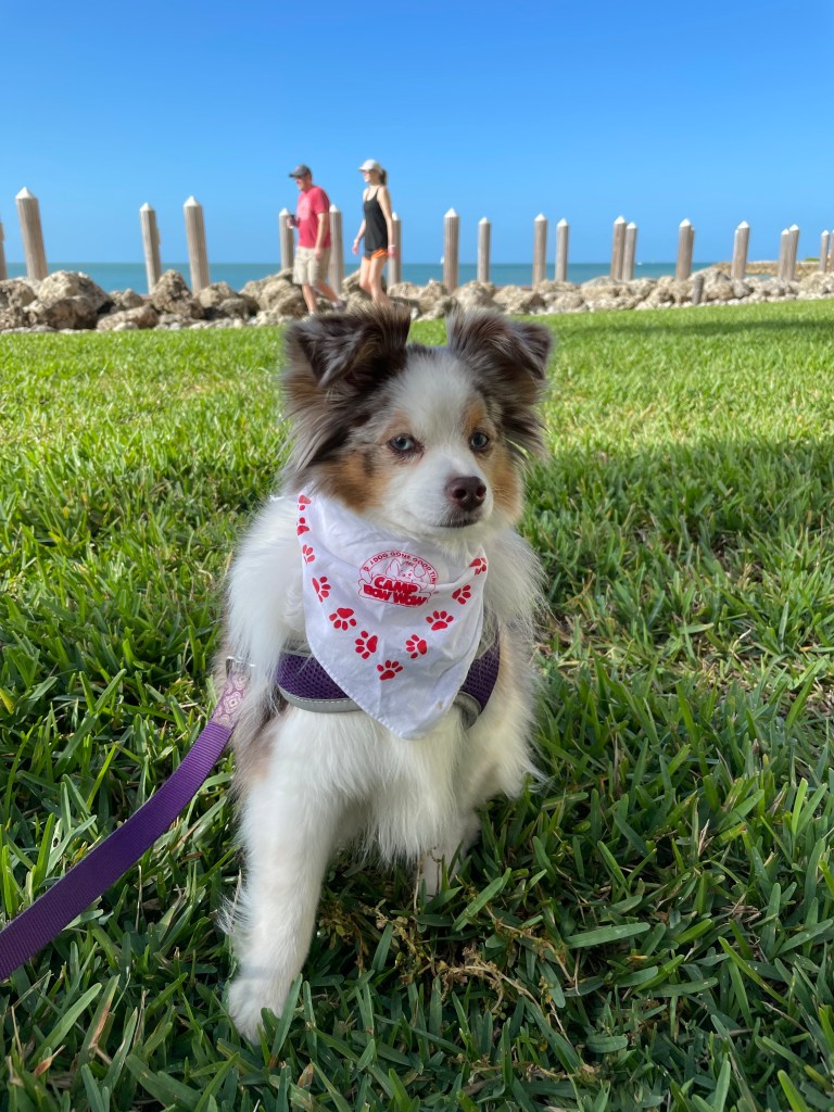 The other day Momma had to travel to Fort Myers for “meetings.” Not able to find someone to stay with me, and apparently unable to bring me along, she dropped me off at Camp Bow Wow in Naples. It was actually quite a nice stay for me as Momma also scheduled a much needed shampoo, FURminator blowout, clipping of the matted fur under my ears (for which they charged extra and Momma was not happy and now I’m scared she will do it herself), nail trim, and “enrichment” cuddle and playtime. I was placed in Toyland with size-appropriate dogs, and had my own private cabin for the night! Here I am wearing my new Camp Bow Wow scarf during our walk this morning!