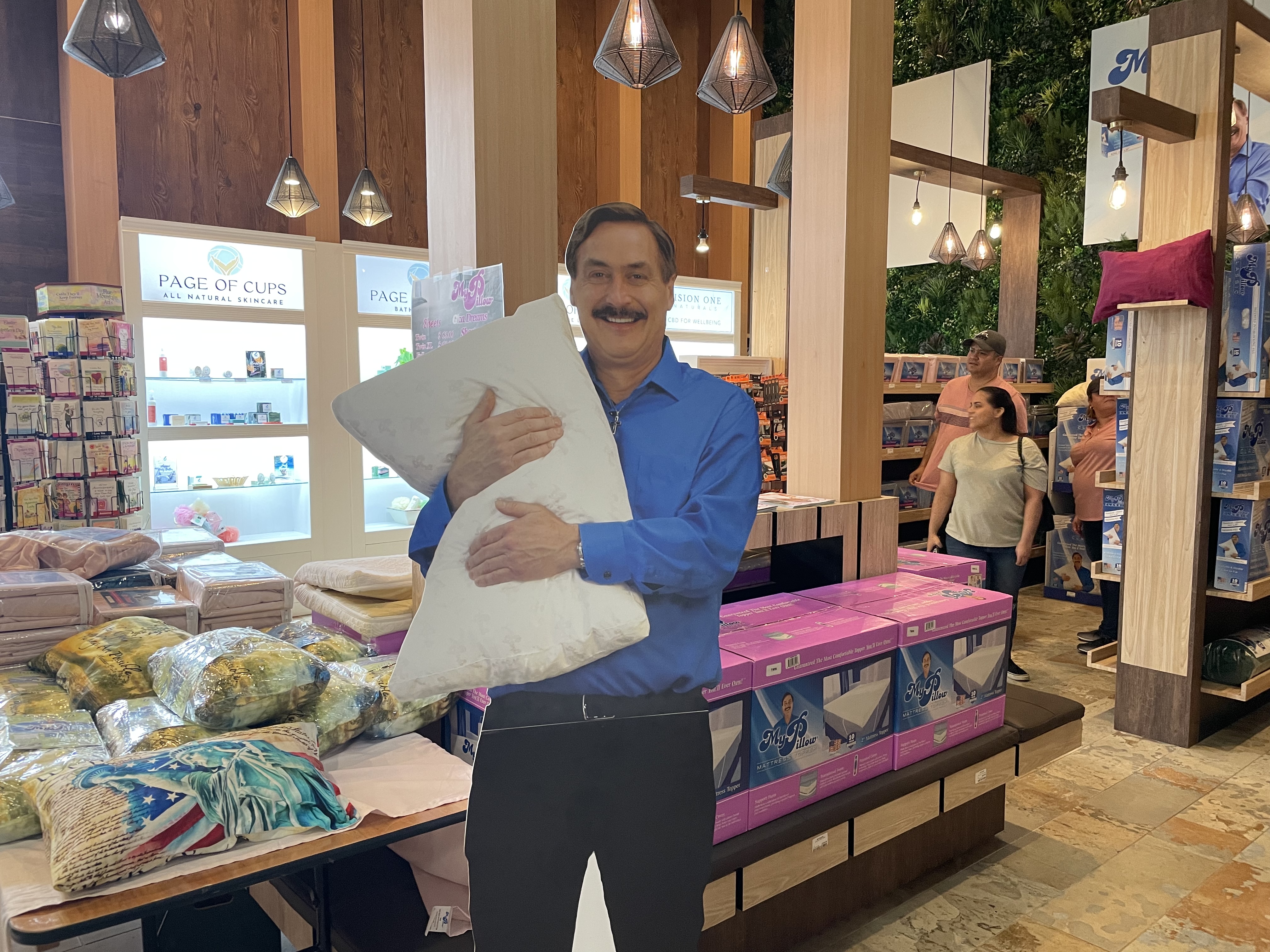 At the front entrance, Momma was happy to find a man selling paraphernalia of our esteemed former president, Donald J. Trump (trust me, this is difficult for me to woof). Then in a corner of the store itself, she came upon a giant picture of the “My Pillow” guy hawking his wares. (Amazingly she was able to forego his exciting new (patented) slippers and pajamas and Giza Dreams bed sheets.) And last but not least, Momma found the wine department featuring a huge display of — you guessed it — Trump wine. This, Momma was not able to forego. And for once she didn’t mind being overcharged. Just woofin’.
